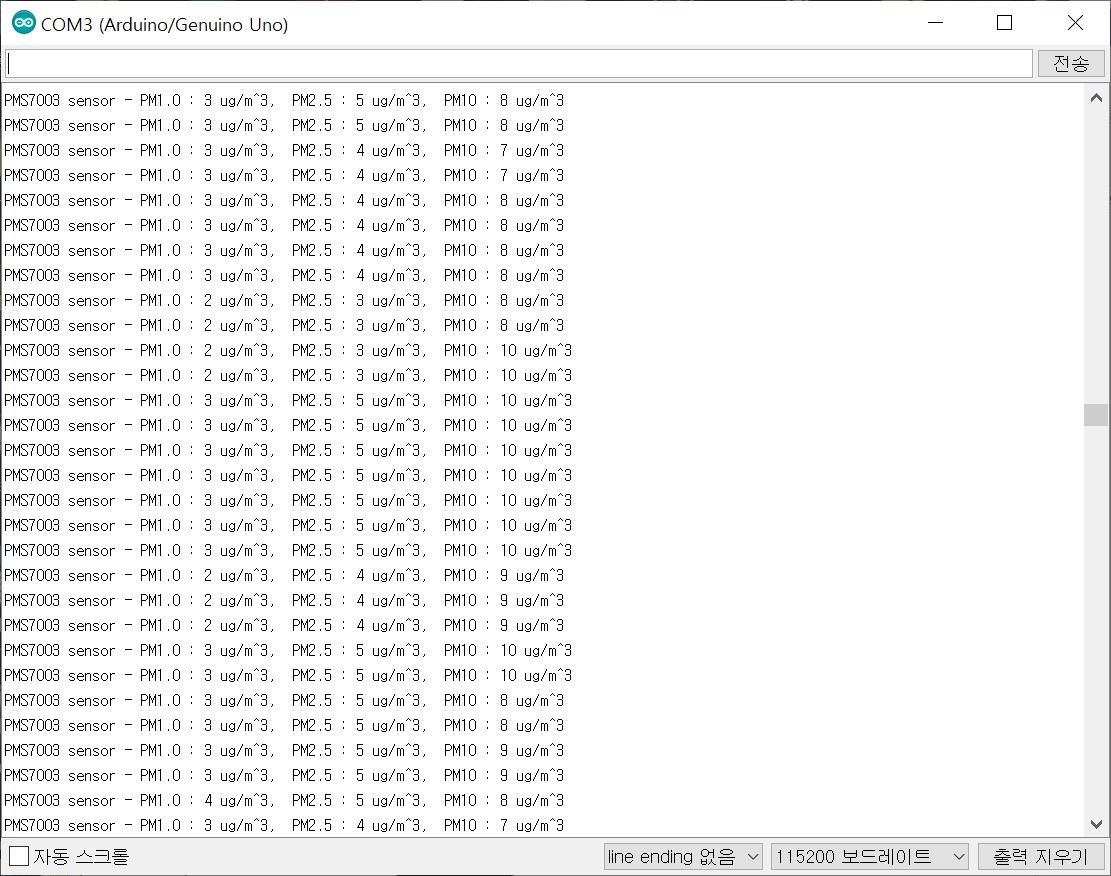 실제 컴파일하여 구동해보면 첨부와 같이 시리얼 모니터를 통해 미세먼지 농도를 구할 수 있다. 농도값이 올라가는 것이 보고 싶다면 수건이나 옷을 가까이에서 털어보면 해당 값이 상승하는 것을 볼 수 있다.