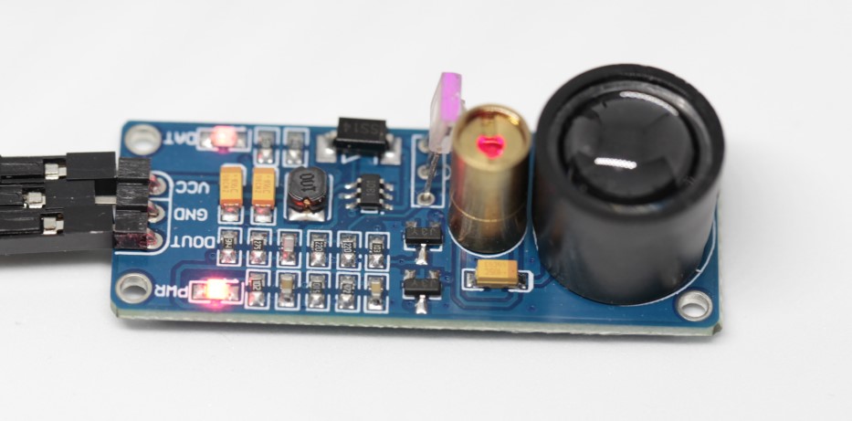[Waveshare Laser Sensor, 레이저 출력부/렌즈 수신부가 보인다. 전원 연결시 PWR LED/레이저에 불이 들어온다]