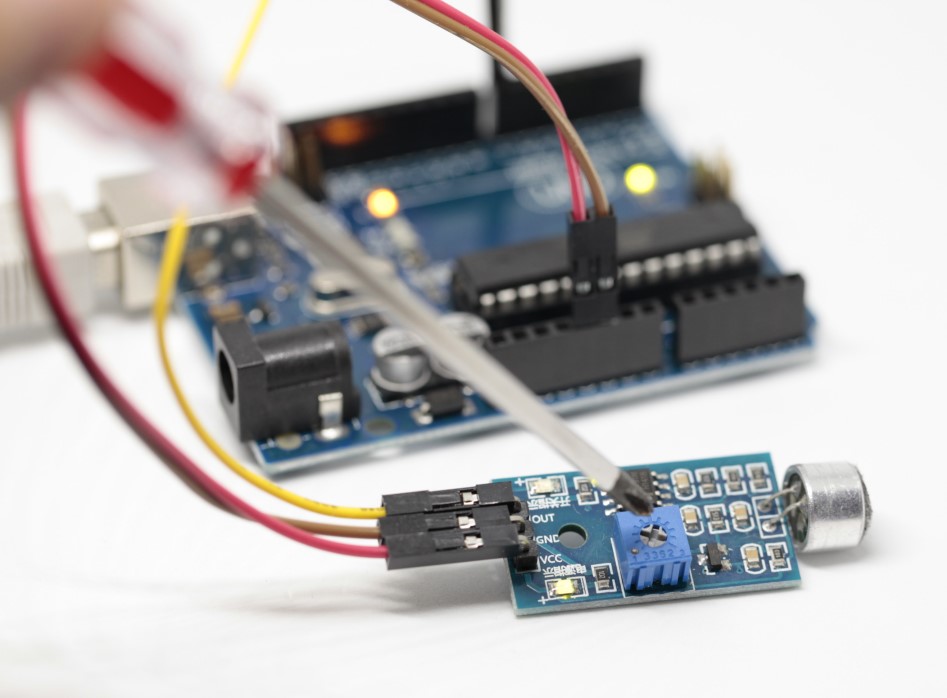 나사를 돌려 조절하면 반시계방향으로 돌릴시 민감해지고, 시계 방향으로 돌릴시 둔감해진다. 꽤 작은 소리부터 꽤 큰소리까지 모두 셋팅 할 수 있었다. 그리고 내부적으로 별도 설정한 소리 레벨에 따라 그보다 크면 왼쪽 상단부 LED에 불이 들어와서 시각적으로 센서 작동 여부를 잘 알 수 있다. 이렇게 감지되면 또한 모듈의 OUT핀에 HIGH 전압이 걸리는 것을 감지해서, 소리 감지 여부를 아두이노 내에서도 확인할 수 있게 된다.