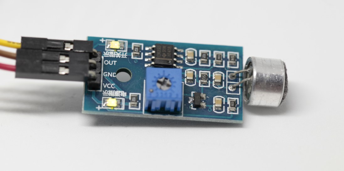 FC-04는 특정 크기의 소리가 발생했는지를 감지할 수 있는 저가의 센서이다(Aliexpress에서 개당 천 원이 넘지 않는다). 다만 작동은 단순하고 꽤 정확하다. 곧바로 모듈 사진을 보면 소형 마이크로폰(오른쪽)과 음량 기준을 조절할 수 있는 나사 조절부, 전원 표시 LED 및 임계치 소리를 넘었는지 표기하는 LED등으로 이루어져있음을 알 수 있다.