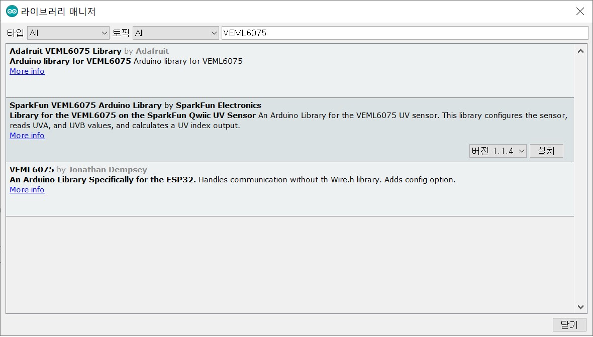 [SparkFun VEML6075 Arduino Library를 선택해 ‘설치’하자]