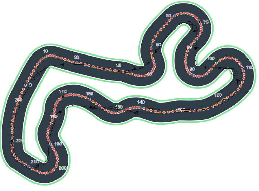 그러나 각 코스별 최상을 원한다면 아래 전략이 유효해보인다. 예를들면 아래는 2019 champion race course이다. 단지 도로 위의 카메라 영상만을 보고는 최고속의 부드러운 길을 미리 알 수 없으니 강제로 그 길을 미리 정해주는 것이다. 고속 주행을 위해서는 영상만으로 부족한 정보를 추가해주는, 유효한 전략이 아닐 수 없다.