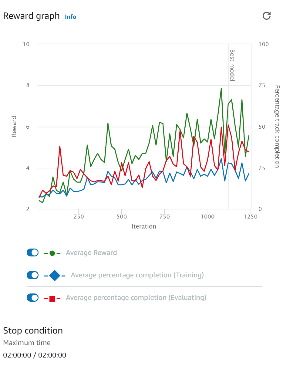 학습 모델은 디폴트에서 조금씩 변형을 가하는 것이 좋지만 디폴트로도 우선 좋다. 학습 시간은 1시간에서 4시간을 조절해보면 아래와 같이 좋아지는 그래프를 볼 수 있다. 좋은 reward function을 설계해야만 강화학습에서 좋은 결과를 볼 수 있다. 그래서 처음 20분 정도 학습시에 이 reward증가세를 보고 학습을 지속할지 판단하는 것도 노하우이다. 아래 보면 2시간 30분간도 reward가 계속 잘 상승하는 것을 볼 수 있다. reward function이 좋지 않으면 이 수치 증가가 매우 더디며 횡보한다. (max speed가 높아도 잘 그렇게 된다)